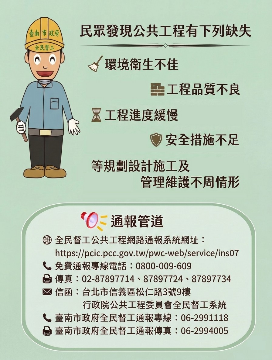 全民督工是行政院公共工程委員會提供的民眾通報機制,專門反映施工品質不良或閒置公共設施。通報管道包括免付費專線「0800-009-609」、全民督工網路通報系統、以及掃描工程告示牌的QR Code。 通報連結如下